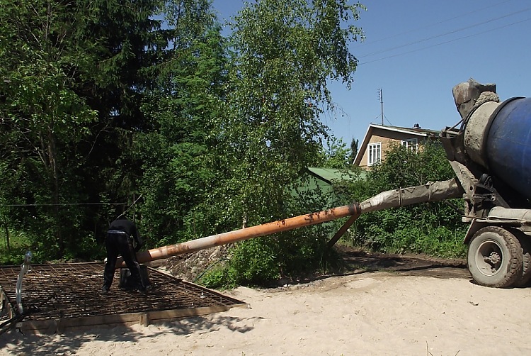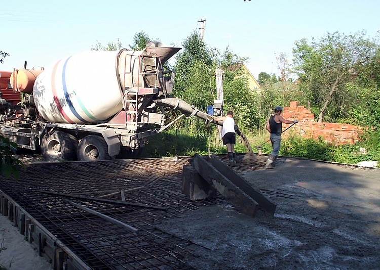 Льём. Дело ответственное, можно разом все и испортить. Перед главной плитой имеет смысл поупражнятся на сараях, банях, машиноместах и всяческих подбетонках.
