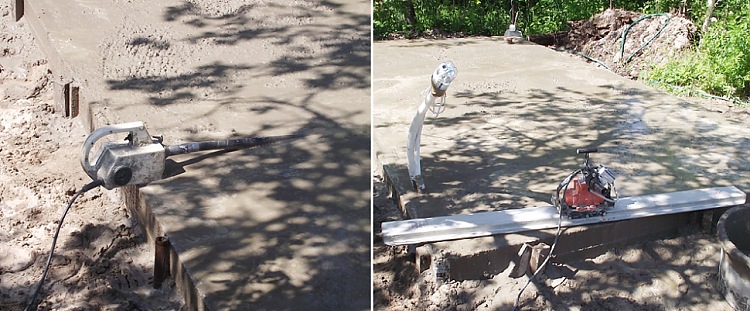 На песок надо положить полиэтиленовую пленку, с нахлыстом, чтобы вода из бетона не ушла. Для выравнивания поверхности бетона удобно применить свободноплавующую (без направляющих) вибротрамбовочную рейку, взятую на прокат.