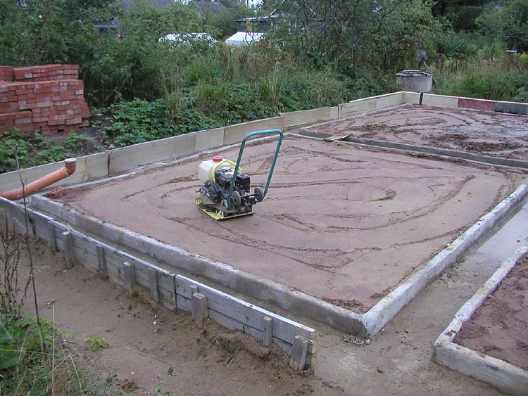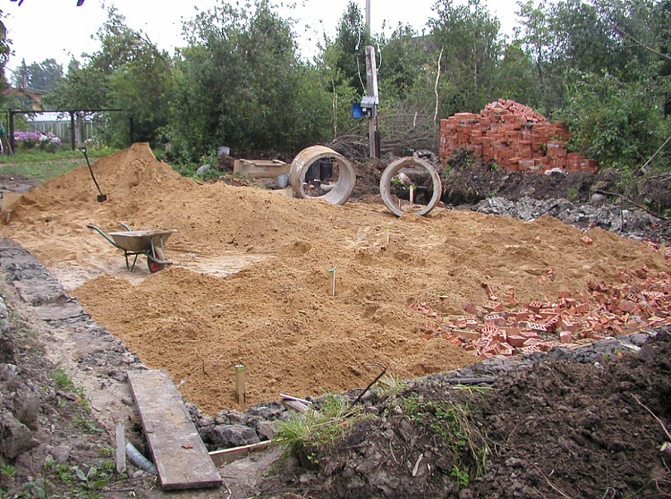Изготовленный котлован следует заполнить утрамбованной песчанно-щебневой (гравийной) смесью. Для трамбования удобнее всего взять в прокат вибротрамбовку. Можно поливать смесь водой и ждать, пока высохнет. Можно катать по песку железобетонные кольца. Также приветствуется участие в трамбовке грузовиков, которые будут привозить щебень и песок.