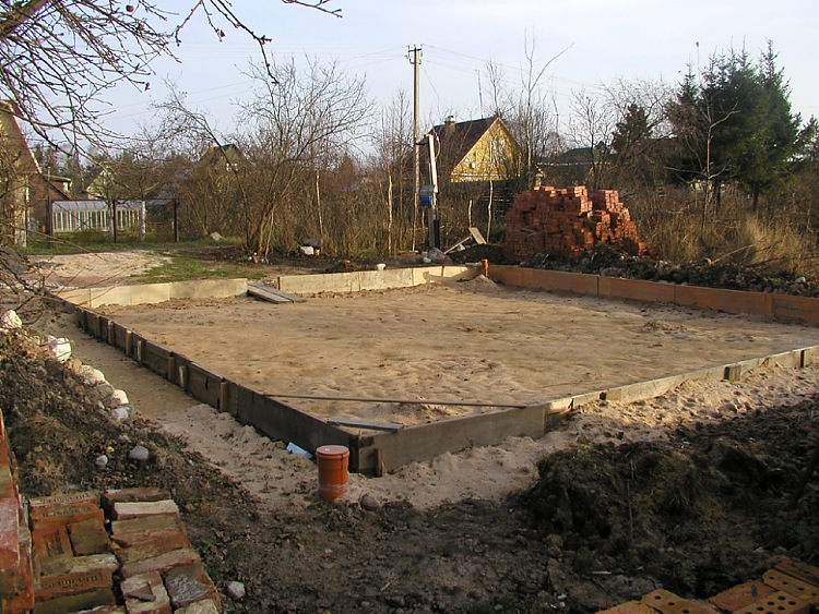 На фотографии - пример создания рельефной подбетонки. Плита, заливаемая на такое будет разной толщины, где надо больше прочности - потолще, где не надо - потоньше. Общая прочность не страдает, бетон экономится. Выполнено было из старинного кирпича нестандартных размеров с обмазкой раствором. При этом нет необходимости бетонировать сверху эти четыре квадрата. Недостаток - неудобно класть гидроизоляцию.