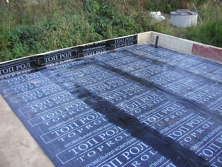 На подбетонку кладется рулонная гидроизоляция (Та, что на фотографии - не самая лучшая), с заходом на опалубку. Кладется как положено, со сплавлением швов (10см, учитывать при расчете) и проливкой битумом слабых мест, а если захочется, то и всех швов - хуже не будет. К опалубке удобно крепить скрепками.