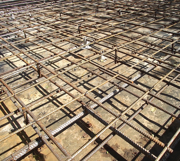 Затем выставляется и вяжется арматура. Горизонтальных слоев не менее двух. Т.е., например при толщине плиты - 10-20см - 2 слоя, 30см - 3 и т.д. Класс, естественно, AIII. Диаметр горизонтальных прутьев 12-16мм, шаг 200мм; вертикальных стержней - от 8мм, шаг 400мм. Защитный слой бетона, т.п. пространство, где бетон есть, а арматуры нет, сверху и снизу 25мм, с боков - 35мм, обеспечивается специальными пластмассовыми фиксаторам нужного типа и размера. При состыковке арматурины должны заходить друг на друга на 200-300мм. На углы неплохо поставить дополнительный прут, согнутый на 90°.